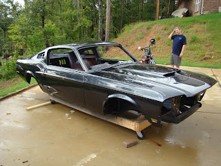 At this point in the build, it was time to send the car out for paint. Amost everything that needed to be, had been mocked-up. We built a simple wooded cart with casters to transport the car to the body shop. The paint color is shadowy granite mica, and looks great with the lines of the mustang. The doors on the mustang are very tight, and are going to close nicely. I want to re-iterate that everything on this car is either new, or rebuilt. Also, everything on the car that can be is powder coated. Paint was only used in situations where parts could not be disassembled to level needed for the powder coating process. Wow, look at that paint!
